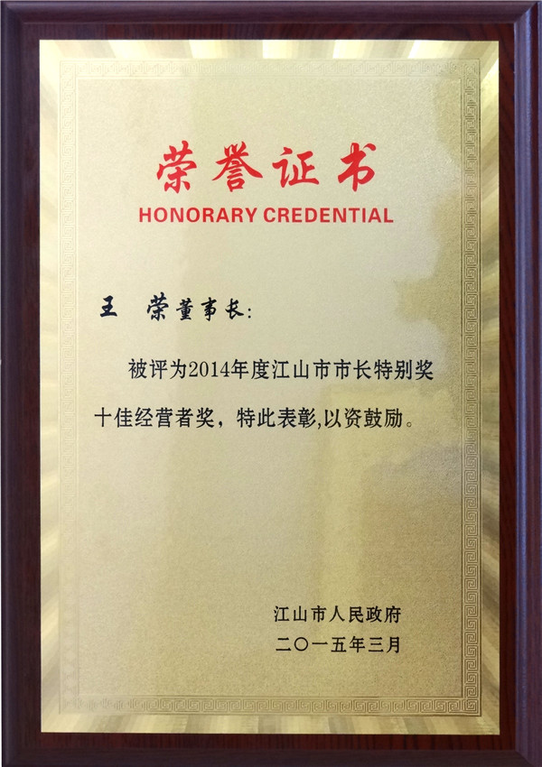 喜訊:王榮董事長被評為2014年度江山市市長特別獎十佳經營者獎