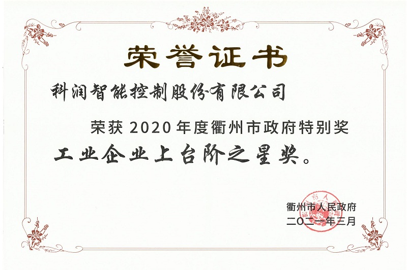 熱烈祝賀科潤智控榮獲衢州市政府特別獎“工業企業上臺階之星獎”!