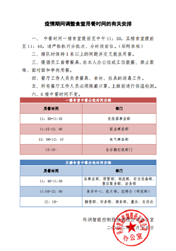 及時轉發衢州發布、江山發布等載體關于新型冠狀病毒防控常識、核酸檢測注意事項和最新疫情通報等,教育引導廣大員工以科學的態度認識疫情,并發出告員工通知書,號召全體員工用實際行動,共同守護幸福家園,展現科潤智控全體員工的擔當和力量。截止3月17日,公司全體員工已全部完成第一輪核酸檢測;對外來人員和車輛出入嚴格控制,要求正確佩戴口罩、掃碼、測溫、消毒、登記、查看48小時核酸報告;公司全域消毒;食堂錯時就餐,排隊間距控制在一米等。