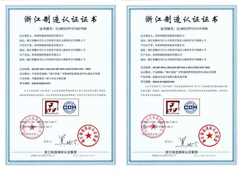 8月5日,科潤智能控制股份有限公司的兩款產品----節能低噪音三相干式電力變壓器、油浸式非晶合金鐵心配電變壓器獲得“品字標浙江制造”認證。